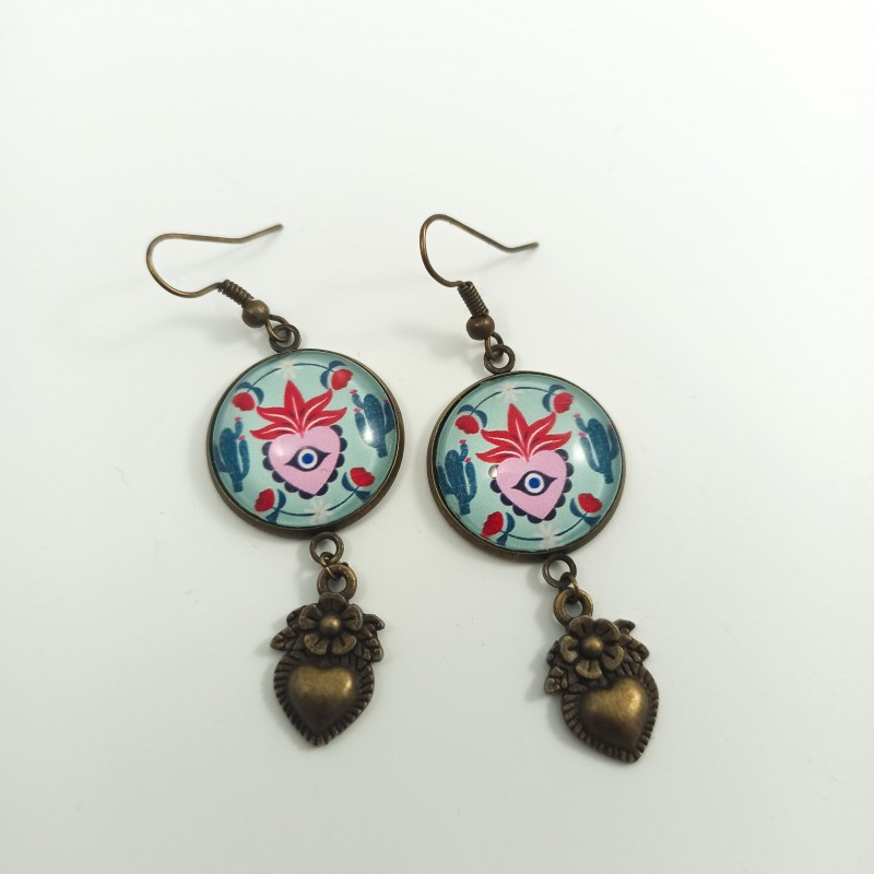 Boucles d'oreilles cabochons aux motifs d'inspiration mexicaine avec cactus et cœur sacré.