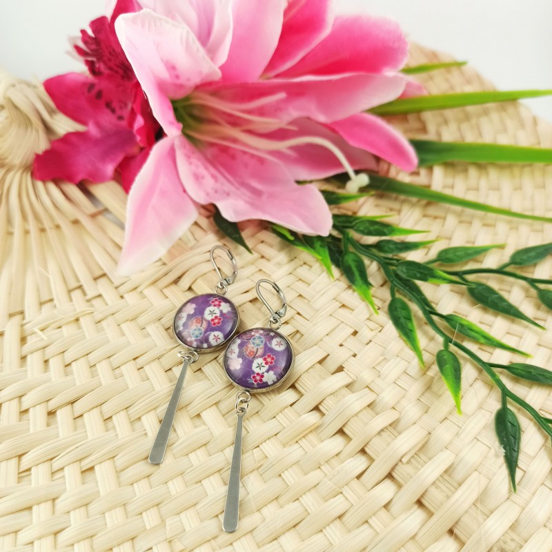 Boucles d'oreilles cabochons fleurs sur fond lilas