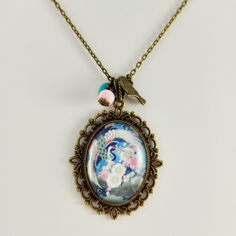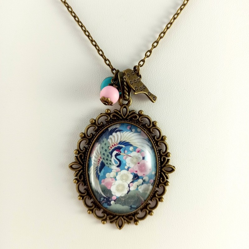 Adorable sautoir représentant un jardin et une grue japonaise.