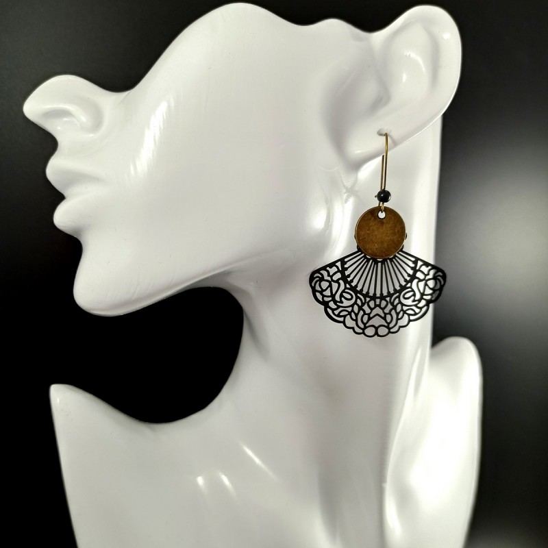 Grandes breloques éventail façon estampe, ultra légères malgré leur taille, accompagnées de sequins en laiton et perles.