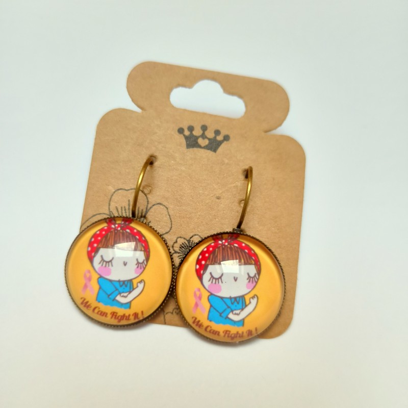 Parce que le Cancer du Sein nous concerne toutes de près ou de loin, je vous propose ces jolies boucles d'oreilles qui représente une femme forte et prête à se battre, reprenant l'iconique Rosie la Riveteuse et son "We can do it!" qui devient "We can fight it!" (on peut le combattre!)