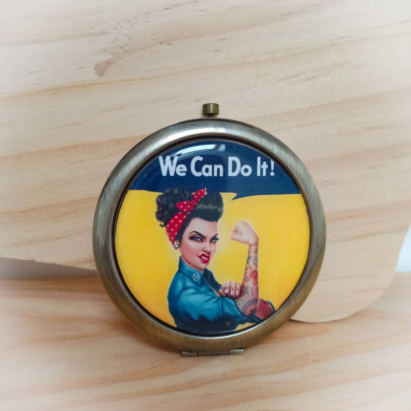 Adorable miroir de poche en laiton couleur bronze à l'effigie de la fameuse Rosie en version rock'n'roll!