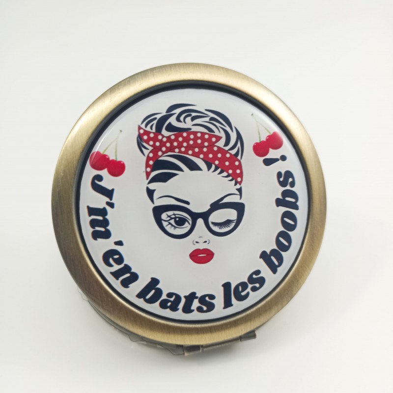 Adorable miroir de poche en laiton couleur bronze à l'effigie d'une Pin-Up au caractère bien trempé !