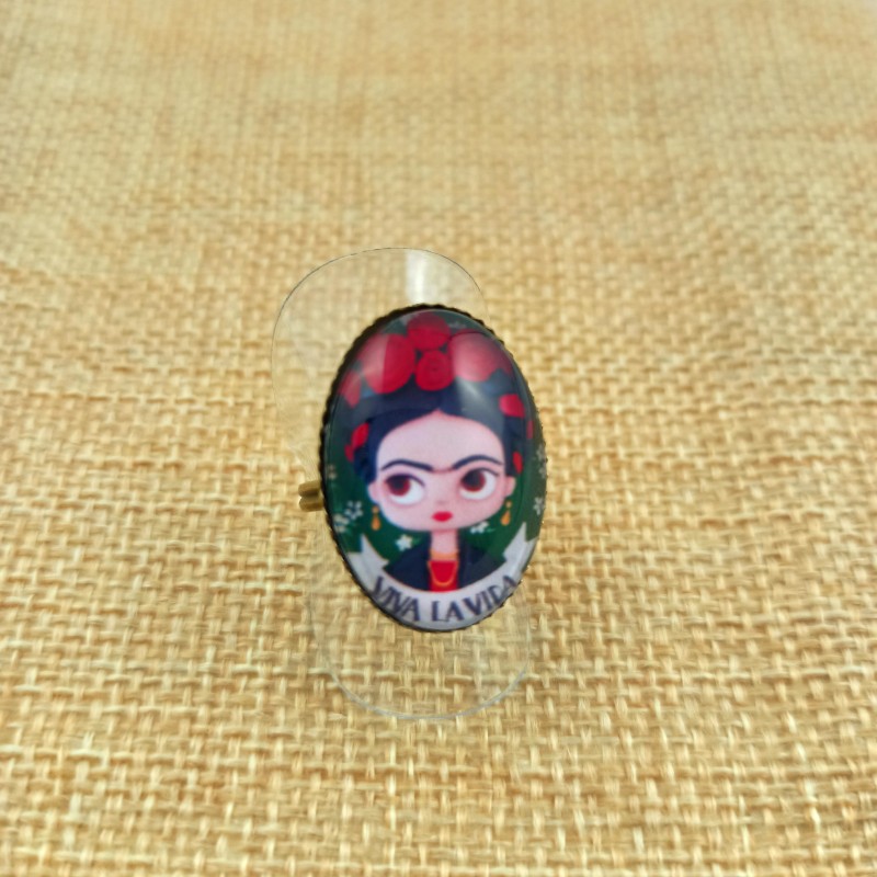 Adorable bague cabochon ovale au motif à l'effigie de l'iconique Frida Kahlo.