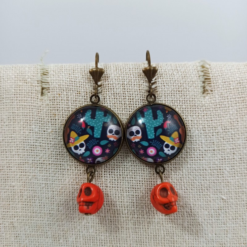 Jolies boucles d'oreilles cabochons motifs Día de Muertos avec breloques calaveras colorées.